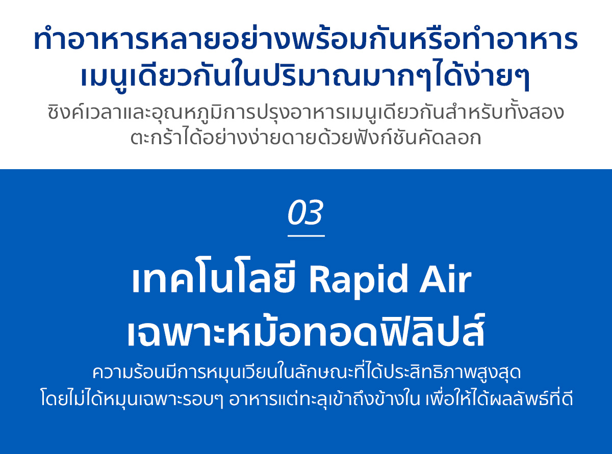 ด้วย เทคโนโลยี Rapid Air เอกสิทธิ์เฉพาะของฟิลิปส์ เครื่องทอดไร้น้ำมัน เครื่องนี้จะช่วยให้อาหารทุกจานของคุณอร่อยเหาะ กรอบนอกนุ่มใน สุกทั่วถึงแบบมืออาชีพ ที่สำคัญคือสุขภาพดีขึ้นแบบก้าวกระโดด เพราะมันช่วยลดไขมันได้สูงสุดถึง 90%* เมื่อเทียบกับการทอดแบบน้ำมันท่วมแบบเดิม ๆ เป็น เครื่องอบไร้น้ำมัน ที่เร็วและประหยัดพลังงานกว่าเตาอบแบบดั้งเดิมถึง 70%** ตอบโจทย์คนยุคใหม่ที่รักความอร่อยและสุขภาพ