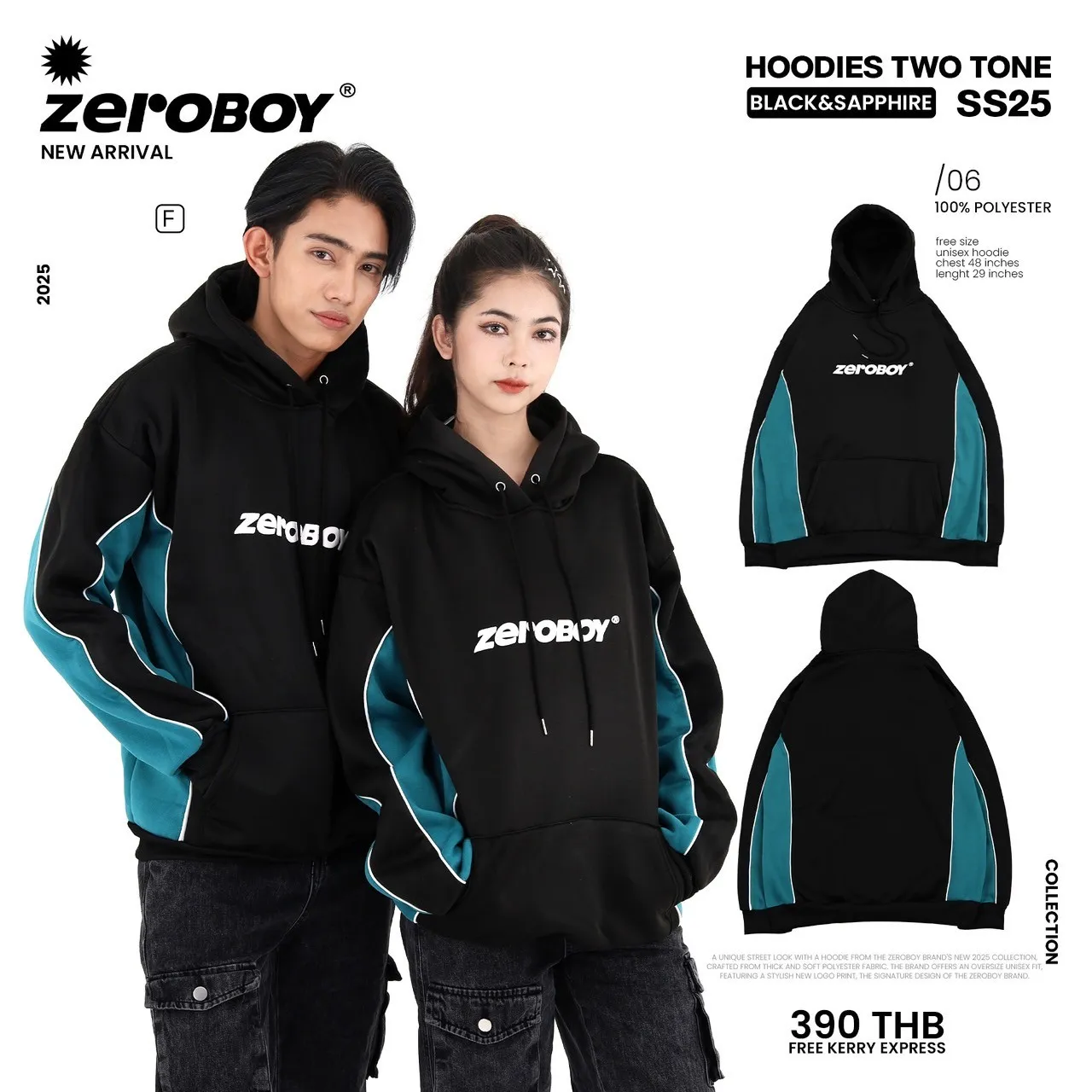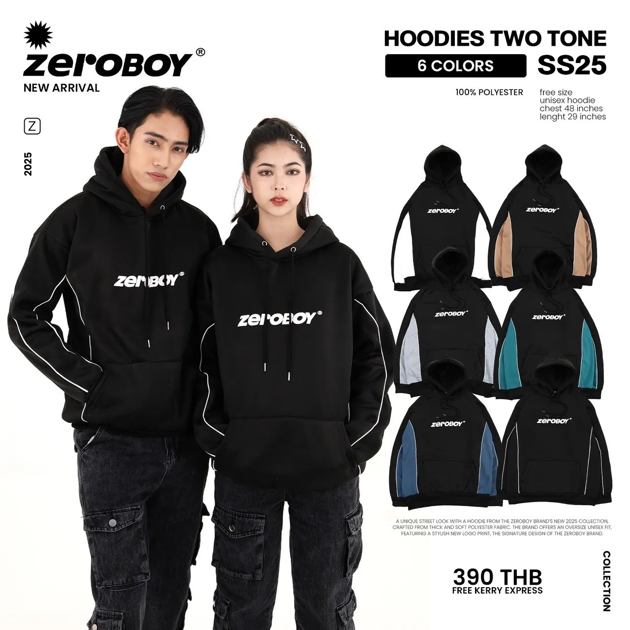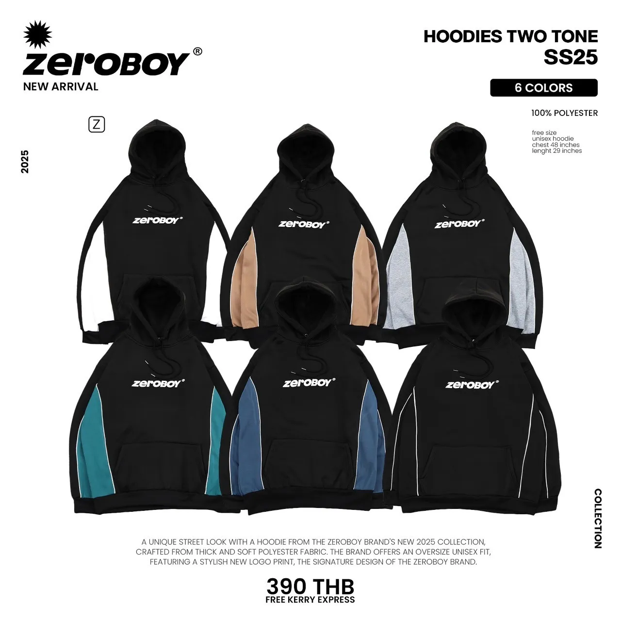 ZEROBOY - Hoodies Two Tone SS25 สีดำแถบขาว สีดำแถบน้ำตาล สีดำแถบเทา สีดำแถบเขียว สีดำแถบน้ำเงิน สีดำแถบดำ