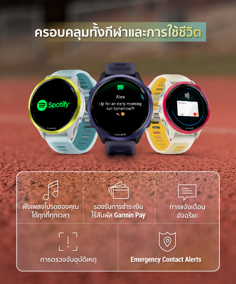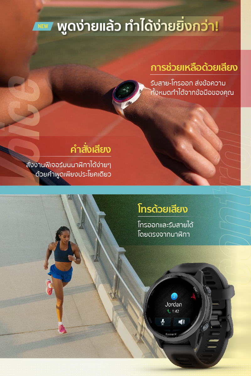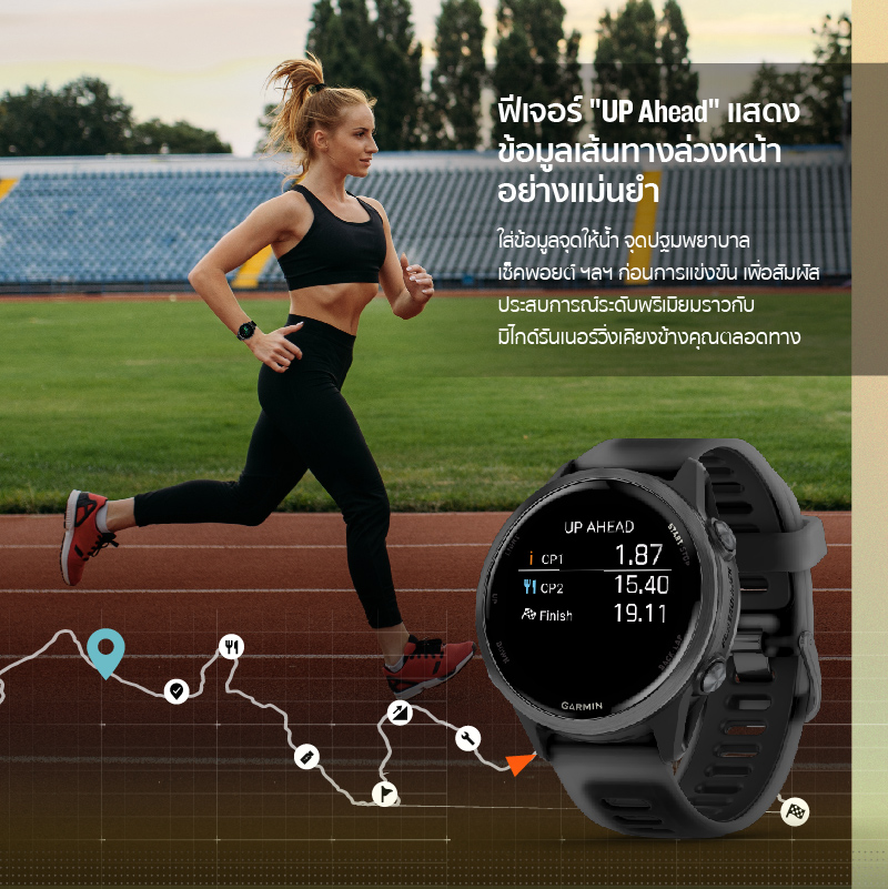 สมาร์ทวอทช์ผู้ชาย และ สมาร์ทวอทช์ผู้หญิง รุ่นนี้ ยังช่วยให้คุณวางแผนการฝึกซ้อมได้อย่างชาญฉลาด ไม่ว่าจะเป็นการใช้ระบบนับรอบด้วย GPS, การบันทึกเวลาเข้าเส้นชัยอัตโนมัติ และฟีเจอร์ "UP Ahead" ที่จะแสดงข้อมูลเส้นทางล่วงหน้าอย่างละเอียด บอกจุดให้น้ำ จุดปฐมพยาบาล หรือเช็คพอยต์สำคัญๆ เสมือนมีไกด์รันเนอร์ส่วนตัว นอกจากนี้ยังสามารถแชร์ข้อมูลการวิ่งและตำแหน่งแบบเรียลไทม์กับเพื่อนๆ และครอบครัวผ่าน Live Track และ Garmin Share เพื่อความปลอดภัยที่มากขึ้นในทุกเส้นทาง