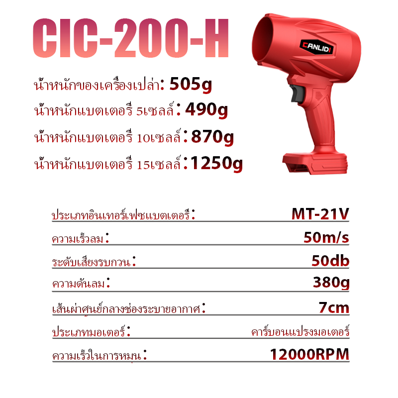 CANLIDI รุ่น CIC-200-H เครื่องเป่าลมไร้สาย แบบพกพา พลังงานสูง พัดลมเทอร์โบ เครื่องเป่าลม เป่าลมไร้สาย High Power Blower Turbo Fan แบตเตอรี่ MT-21V