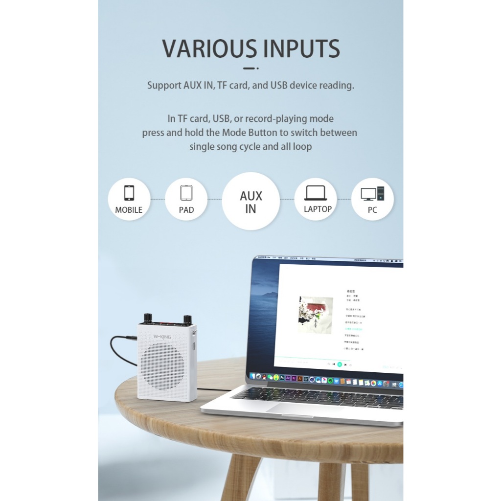 W-King KS16 ไมค์ลำโพงพกพา ที่ออกแบบมาเพื่อมืออาชีพเช่นคุณ! ไม่ว่าคุณจะเป็น ครู อาจารย์ วิทยากร มัคคุเทศก์ หรือ ผู้นำการฝึกอบรม ที่ต้องการ เครื่องขยายเสียง คุณภาพสูง นี่คือตัวช่วยที่ตอบโจทย์ ด้วยกำลังขับ 25W ทำให้เสียงของคุณคมชัด กังวาน ทะลุทะลวงแม้ในห้องเรียนขนาดใหญ่หรือกลางแจ้ง ตัวเครื่องดีไซน์เล็กกะทัดรัด น้ำหนักเบา มีสายคล้องคอ และสามารถ เหน็บเอว ได้อย่างสะดวกสบาย