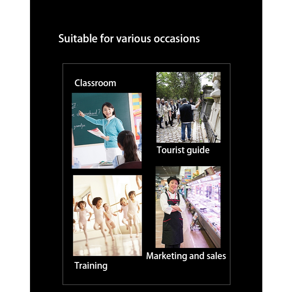 ตัวเครื่องมาพร้อมกำลังขับ ที่ให้เสียงดังคมชัด ไม่แตกพล่า กระจายเสียงได้ทั่วถึงทั้งห้องเรียนหรือกลุ่มทัวร์ ไมค์คาดศีรษะแบบสายคุณภาพสูงจะจับเสียงพูดของคุณได้อย่างแม่นยำ ไม่ต้องพูดใกล้ลำโพง แถมยังใช้งานได้ยาวนานถึง ชั่วโมงต่อการชาร์จเต็มหนึ่งครั้ง ครอบคลุมการสอนได้ทั้งวันสบาย ๆ นอกจากเป็นไมค์สอนหนังสือชั้นยอดแล้ว ยังรองรับการเล่นไฟล์เสียงผ่าน USB และ TF Card เพื่อเปิดเพลงประกอบหรือสื่อการเรียนรู้ได้อย่างง่ายดาย