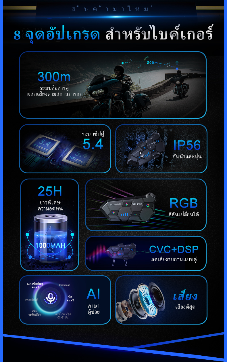 BLAISE ST1 PRO ชุดหูฟังบลูทูธหมวกกันน็อคสำหรับรถจักรยานยนต์สำหรับผู้ขับขี่ 2 คน ระยะสนทนา 300 เมตร