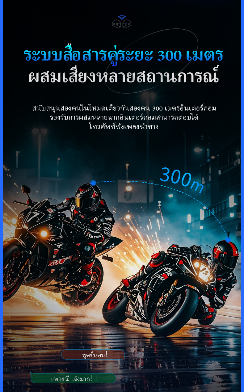 เชื่อมต่อกันได้ง่าย ๆ แม้จะไม่ได้ขี่ติดกัน! ด้วยระยะการสื่อสารที่ไกลถึง 300 เมตร คุณก็ยังสามารถพูดคุยกับคู่หูได้ตลอดเส้นทาง