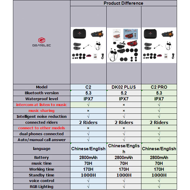 A: GEARELEC C2, C2 Pro และ X2 Plus เป็นเครื่องส่งรับวิทยุสำหรับสองคนทั้งหมด และรองรับการเชื่อมต่อระหว่างกันได้เพียงสองเครื่องเท่านั้น ไม่รองรับการเชื่อมต่อกับเครื่องส่งรับวิทยุรุ่นอื่นค่ะ สำหรับ GEARELEC C2, C2 Pro และ X2Plus รองรับการโทรภายในและการฟังเพลงพร้อมกัน ส่วน C2 Pro และ X2Plus จะรองรับฟังก์ชันการแบ่งปันเพลงเพิ่มเติมค่ะ