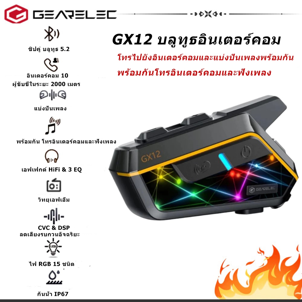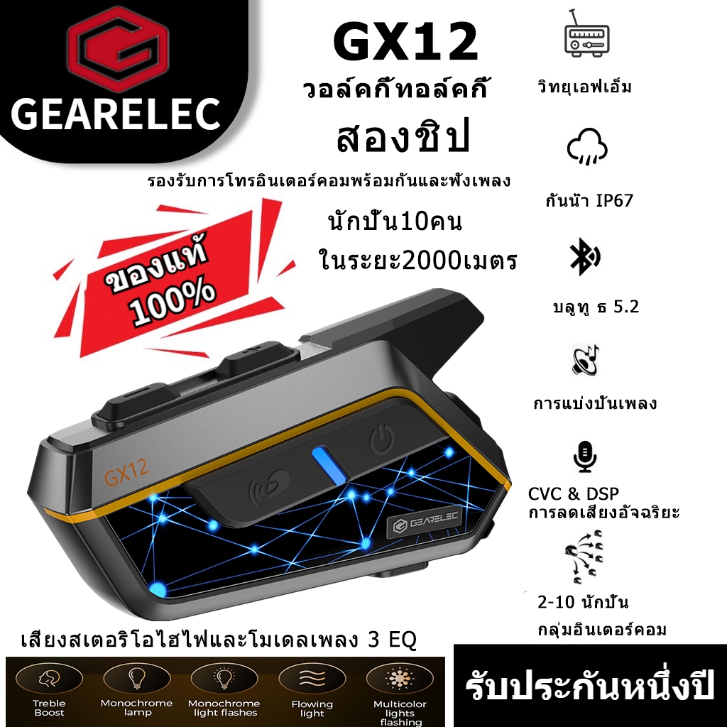 GEARELEC GX12 หูฟังบลูทูธติดหมวกกันน็อค อินเตอร์คอมกลุ่ม ฟังเพลงคมชัด กันน้ำ IP67 พร้อมระบบลดเสียงรบกวนอัจฉริยะ