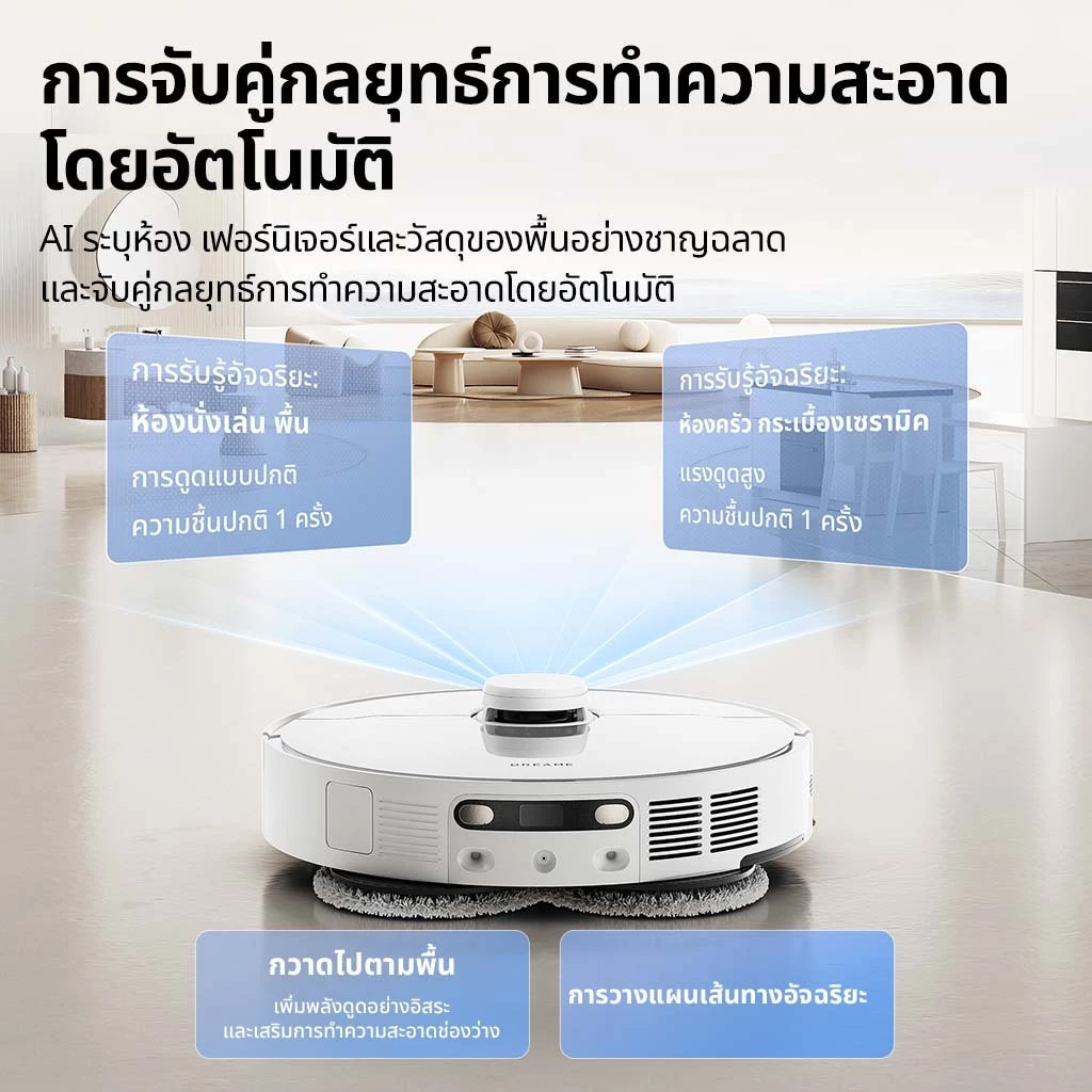 การตรวจจับสิ่งสกปรกหนักด้วย AI และ AI ถูพื้นสองครั้ง : เครื่องถูพื้นอัจฉริยะ นี้สามารถตรวจจับบริเวณที่มีสิ่งสกปรกมากเป็นพิเศษได้ด้วย AI และจะกลับไปซักผ้าถูและถูซ้ำบริเวณนั้นอีกครั้ง เพื่อให้แน่ใจว่าพื้นของคุณจะสะอาดหมดจด ไร้ที่ติอย่างแท้จริง
