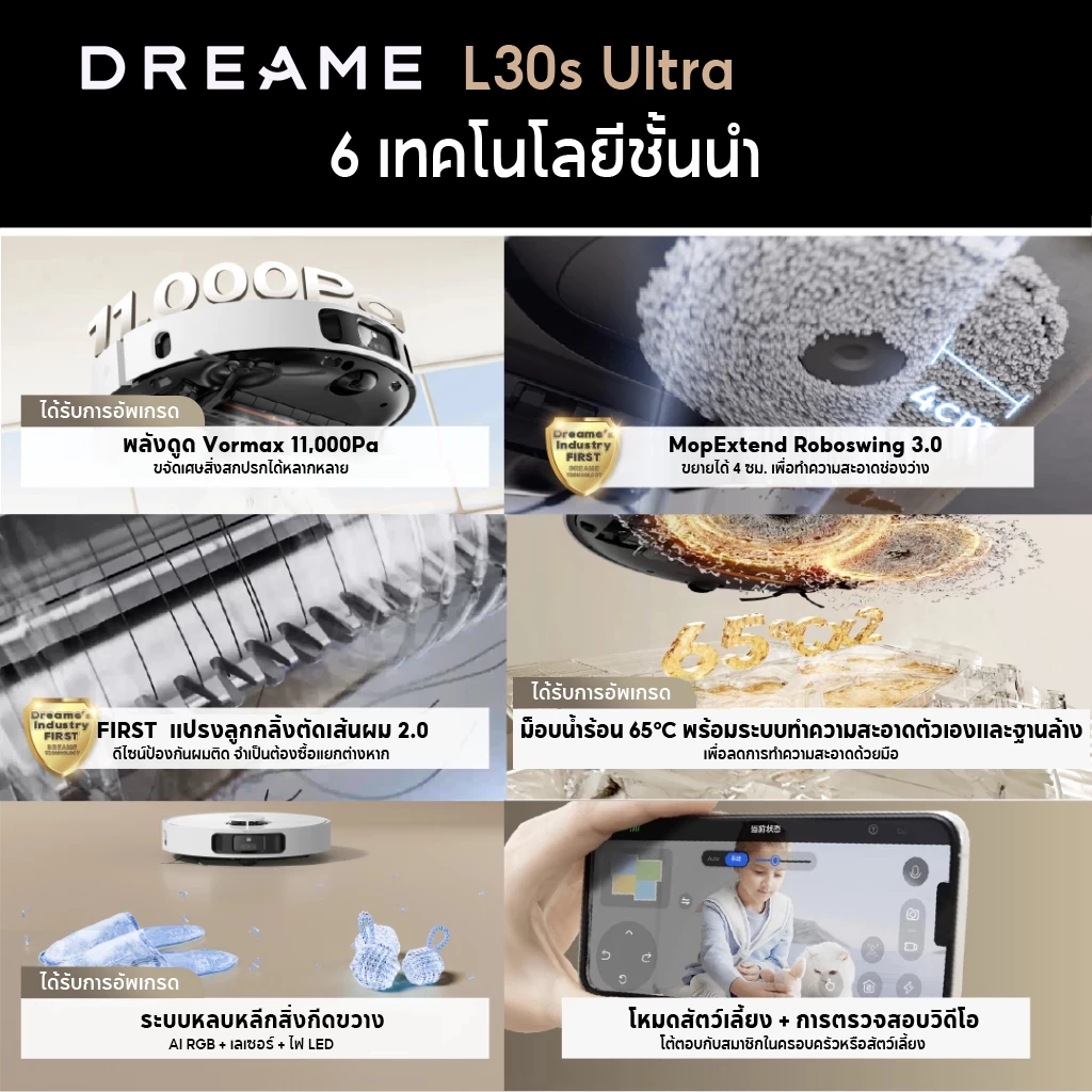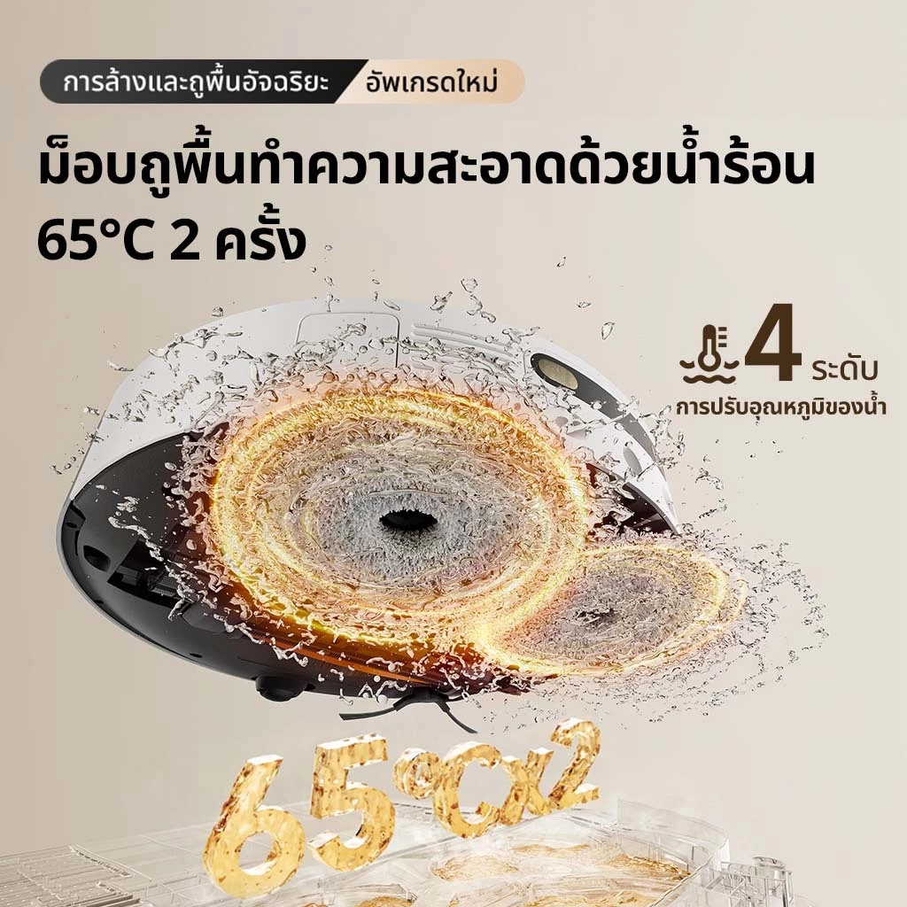 แผ่นทำความสะอาดอัตโนมัติ (ซักด้วยน้ำร้อน 65°C!) : หมดกังวลเรื่องผ้าถูพื้นสกปรกหรือมีกลิ่นเหม็นอับ! DREAME Bot L30s Ultra มาพร้อมระบบซักผ้าถูอัตโนมัติด้วยน้ำร้อน 65°C ช่วยฆ่าเชื้อโรค ลดคราบตกค้าง และกำจัดกลิ่นแบคทีเรีย ทำให้ผ้าถูสะอาดพร้อมใช้งานอยู่เสมอ คุณไม่ต้องลงมือซักเองอีกต่อไป ประหยัดเวลาและแรงงานไปได้เยอะเลย!