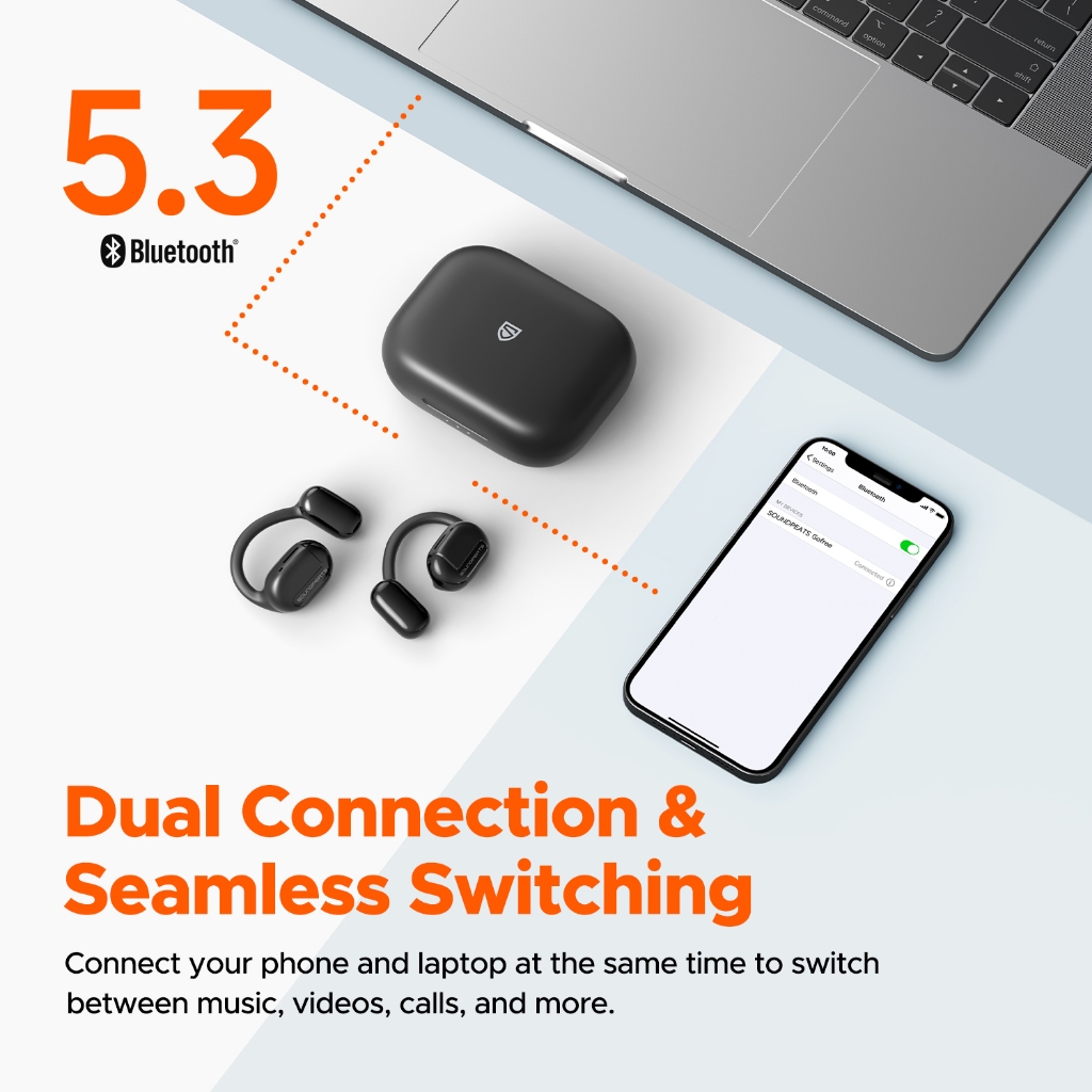 SoundPEATS GoFree คือ หูฟังบลูทูธไร้สาย แบบ Open-Ear ที่ออกแบบมาเพื่อมอบประสบการณ์การฟังเพลงที่เหนือกว่าและตอบโจทย์ทุกไลฟ์สไตล์ของคุณ ด้วย Bluetooth 5.3 ล่าสุด คุณจะได้รับสัญญาณที่เสถียร ไม่มีสะดุด ไม่ว่าจะเดิน วิ่ง หรือเล่นเกม หูฟังไร้สาย รุ่นนี้มาพร้อม Dynamic Driver ขนาดใหญ่ถึง 16.2 มม. ทำให้ได้เสียงที่ทรงพลัง โดยเฉพาะเสียงเบสที่แน่นและลึกจนคุณต้องทึ่ง! ใครที่ชอบ หูฟังเบสหนัก ต้องลอง!