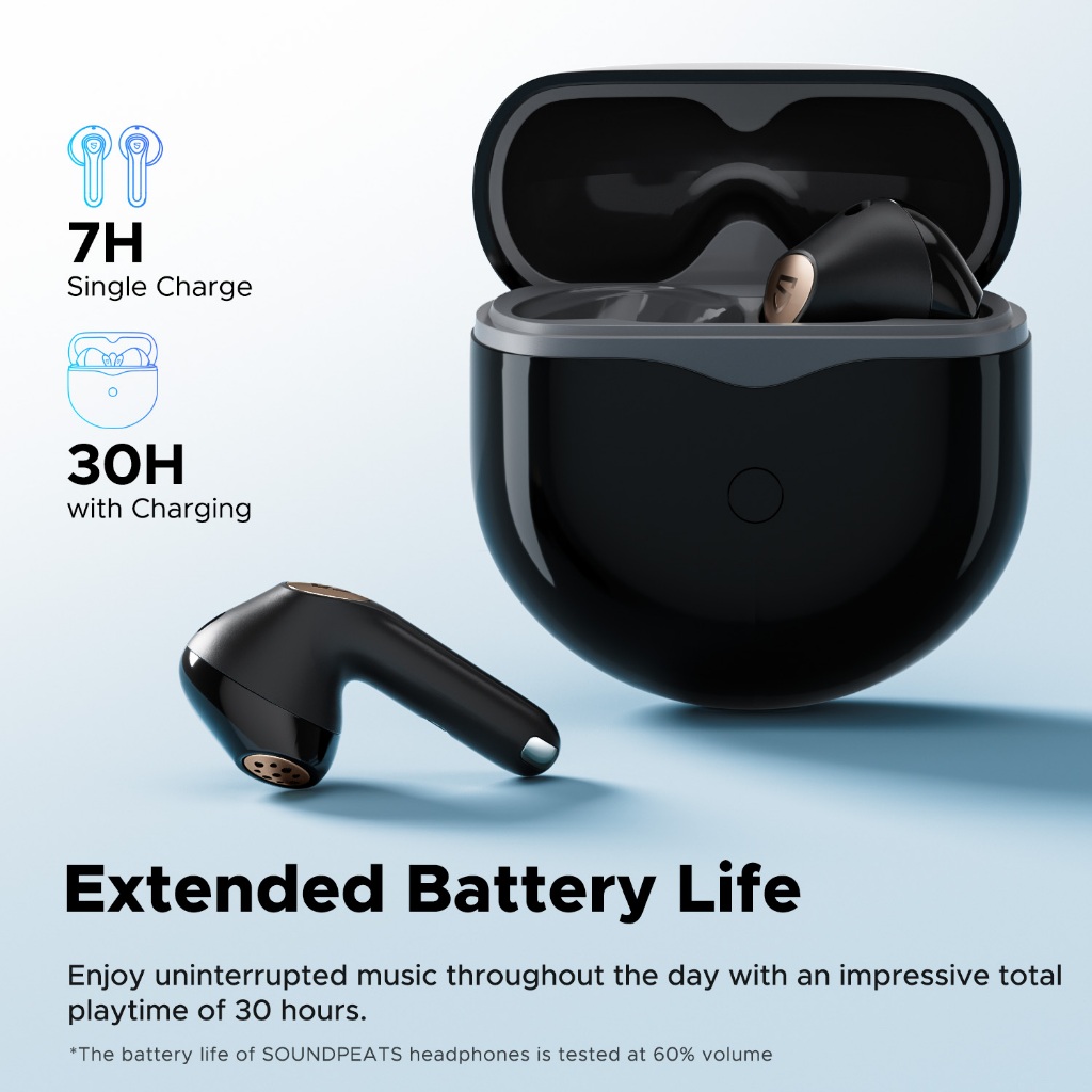 - ใช้งานได้ยาวนาน ตลอดวัน: แบตเตอรี่หูฟังใช้งานได้สูงสุด 7 ชั่วโมงต่อการชาร์จหนึ่งครั้ง และชาร์จเพิ่มจากเคสได้สูงสุด 30 ชั่วโมง ให้คุณเพลินกับเสียงเพลงหรือเกมได้ทั้งวันโดยไม่ต้องกังวลเรื่องแบตหมด