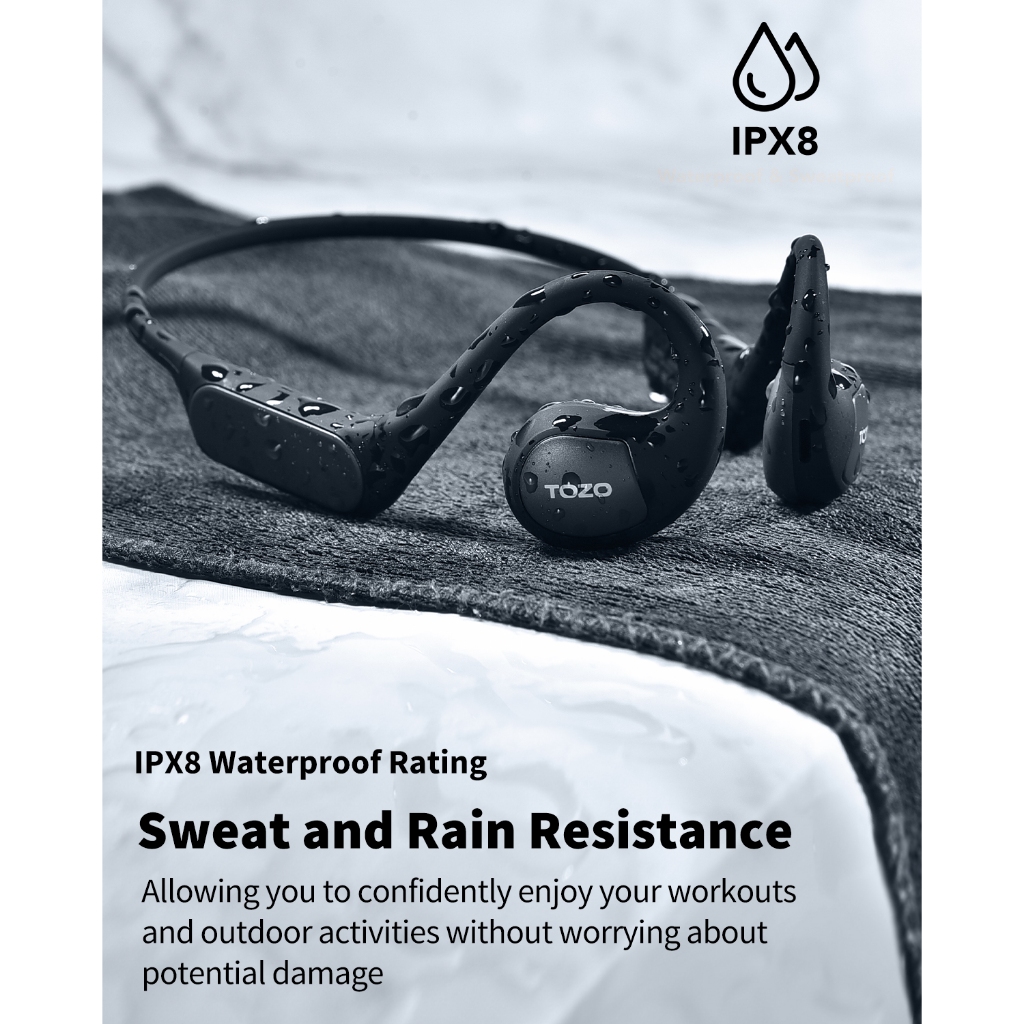 TOZO Open Real ยังโดดเด่นด้วยคุณสมบัติกันน้ำระดับ IPX8 ทำให้หมดกังวลเรื่องเหงื่อหรือละอองฝน เหมาะสำหรับสายออกกำลังกาย หรือผู้ที่ชอบทำกิจกรรมกลางแจ้งสุดๆ และด้วยแบตเตอรี่ที่ใช้งานได้ยาวนานสูงสุด 14 ชั่วโมงต่อการชาร์จหนึ่งครั้ง คุณจึงเพลิดเพลินกับเสียงเพลงได้ตลอดทั้งวันโดยไม่ต้องกังวลเรื่องแบตหมดบ่อยๆ