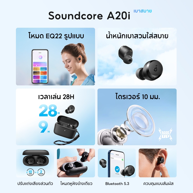 | สิ่งที่อยู่ในกล่อง | Soundcore A20i พร้อมเคสชาร์จ, จุกหูฟัง 3 ขนาด (S,M,L), สาย USB-C, คู่มือ, สายคล้อง |