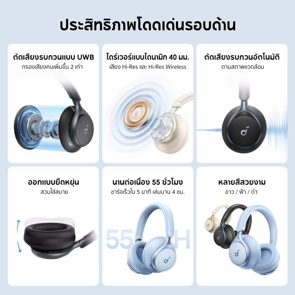 Soundcore Space One หูฟัง Noise Cancelling ไร้สาย LDAC Hi-Res แบตอึด 55H - หูฟังบลูทูธครอบหูตัดเสียงรบกวนที่ดีที่สุดสำหรับคุณ