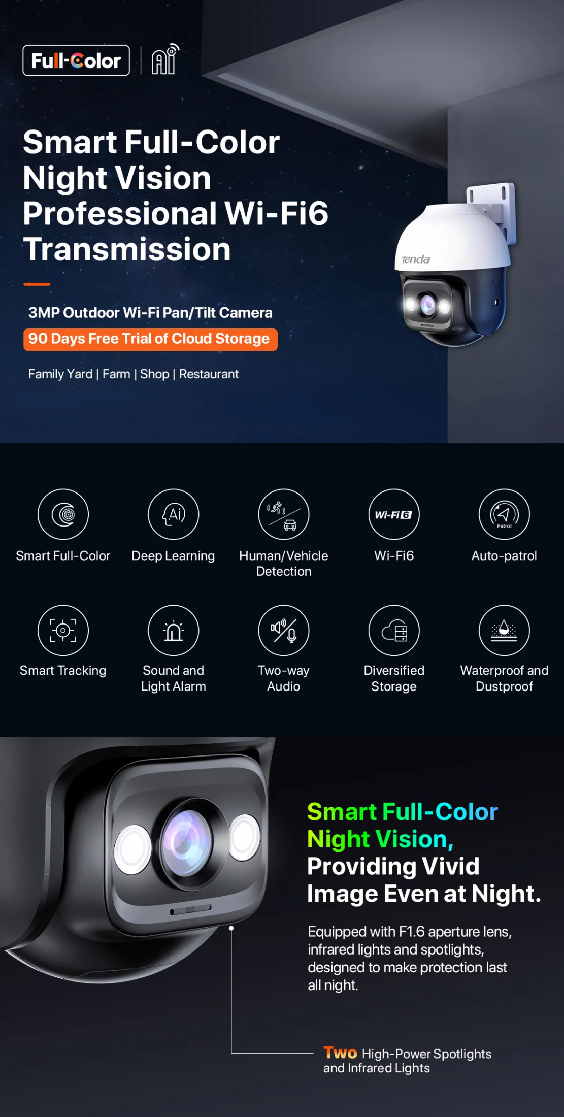Tenda RH3 กล้องวงจรปิดไร้สาย รุ่น RH3-WCA คือผู้พิทักษ์ที่สมบูรณ์แบบสำหรับบ้านของคุณ! นี่คือกล้องวงจรปิดกลางแจ้งประสิทธิภาพสูงที่ออกแบบมาให้ใช้งานง่าย ครอบคลุมทุกความต้องการด้านความปลอดภัย ไม่ว่าจะเป็นลานบ้าน ฟาร์ม หรือร้านค้าของคุณ ด้วยความสามารถในการหมุนรอบทิศทาง 360 องศา คุณจะไม่มีวันพลาดทุกมุมมอง มาพร้อมภาพคมชัดระดับ 2K (3MP) และระบบ Full-Color Night Vision ที่ให้ภาพสีชัดเจนแม้ในที่มืดสนิท นอกจากนี้ยังรองรับการเชื่อมต่อได้ทั้งแบบไร้สายและมีสาย เพื่อความยืดหยุ่นสูงสุด และฟังก์ชันเสียงสองทาง (Two-Way Audio) ช่วยให้คุณสื่อสารได้ทันที พร้อมระบบตรวจจับมนุษย์อัจฉริยะ เสียงเตือน และไฟเตือนที่จะช่วยปกป้องทรัพย์สินของคุณจากผู้บุกรุกได้อย่างมีประสิทธิภาพ