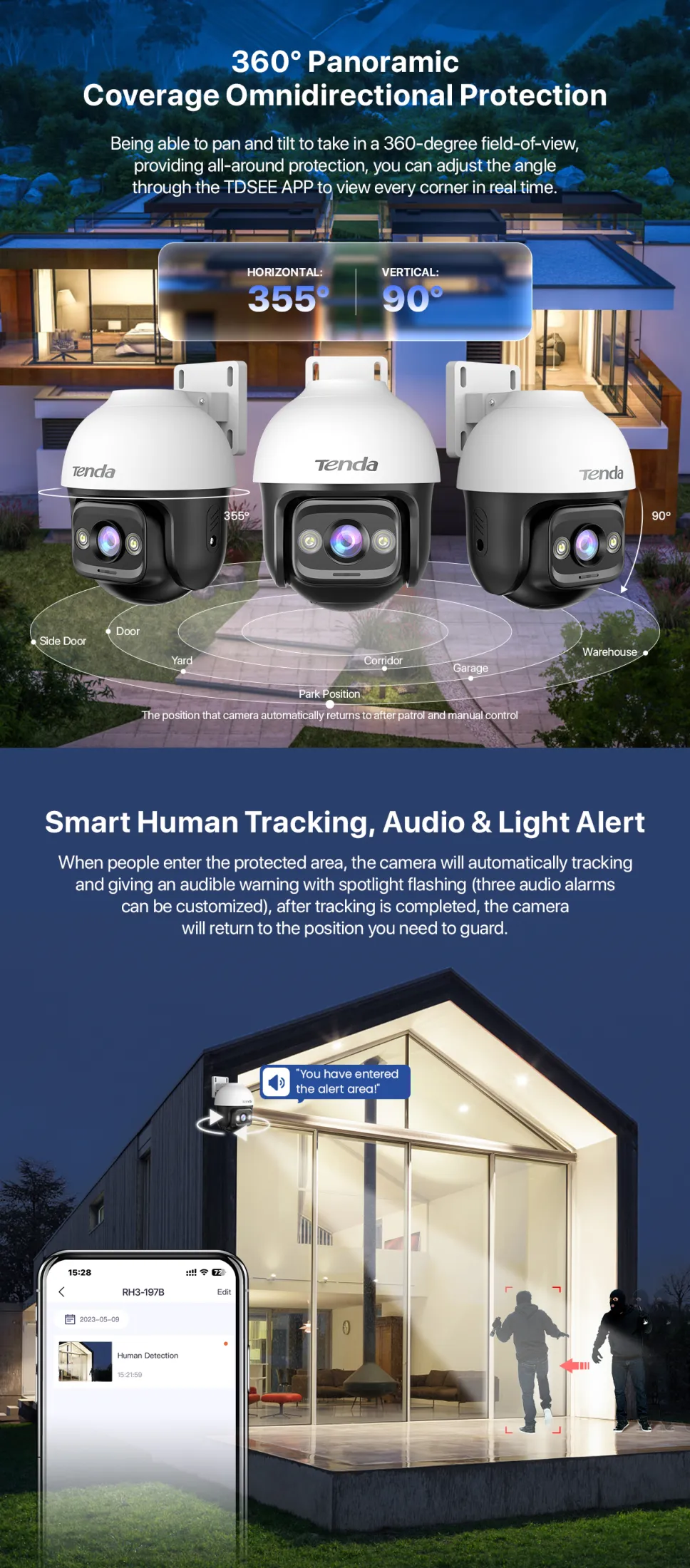 - ฉลาดกว่าที่เคย! ตรวจจับมนุษย์พร้อมเสียงและแสงเตือน: กล้องนี้สามารถแยกแยะความแตกต่างระหว่างมนุษย์กับวัตถุอื่นๆ ได้อย่างแม่นยำ เมื่อตรวจพบการเคลื่อนไหวที่น่าสงสัย ระบบจะส่งเสียงและเปิดไฟสปอตไลท์เพื่อเตือนผู้บุกรุกทันที พร้อมส่งการแจ้งเตือนไปยังแอปพลิเคชันบนมือถือของคุณ ทำให้คุณดำเนินการได้อย่างรวดเร็ว.