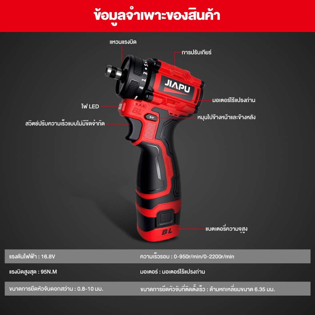 JIAPU แรงบิด 95 N.m ไขควงคลัชไร้สาย เจาะ ขันสกรู 16.8V มอเตอร์ Brushless มอเตอร์บัสเลส สว่าน ไฟฟ้าแบตสว่าน อุปกรณ์ครบกล่อง