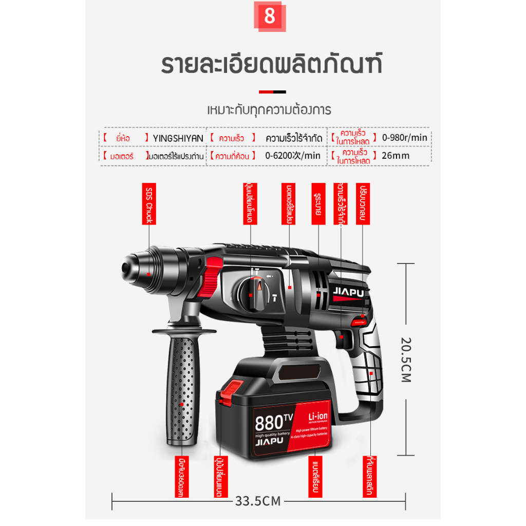 JIAPU MT-21V สว่านโรตารี่ไร้สาย มอเตอร์ไร้แปรงถ่าน เจาะปูน เจาะผนังปูน กระแทกได้ในเครื่องเดียว!