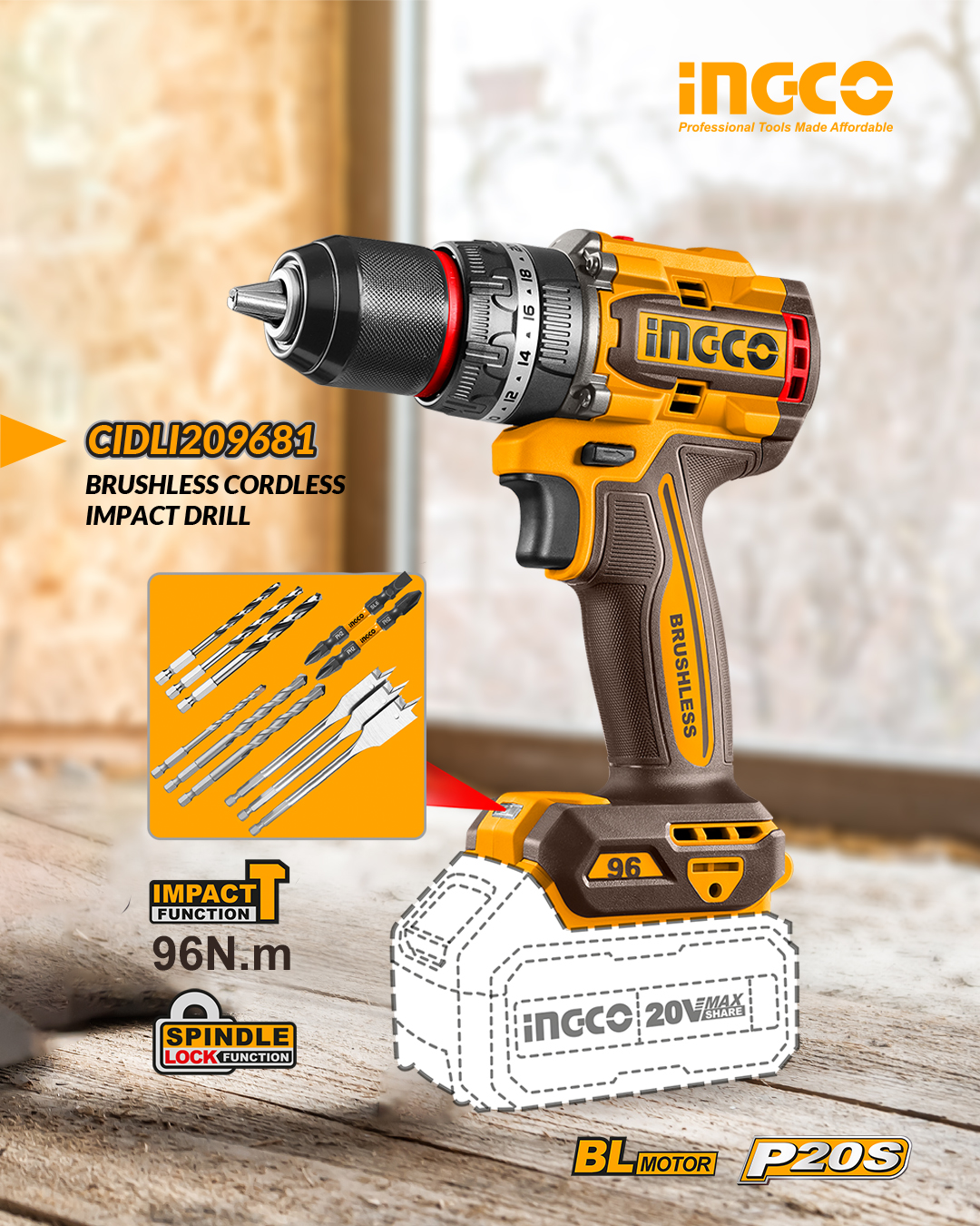 INGCO CIDLI209681 สว่านไขควงคลัช 3 ระบบ แรงบิด 96Nm มอเตอร์ไร้แปรงถ่าน เจาะ ขันสกรู กระแทก ครบจบในเครื่องเดียว!