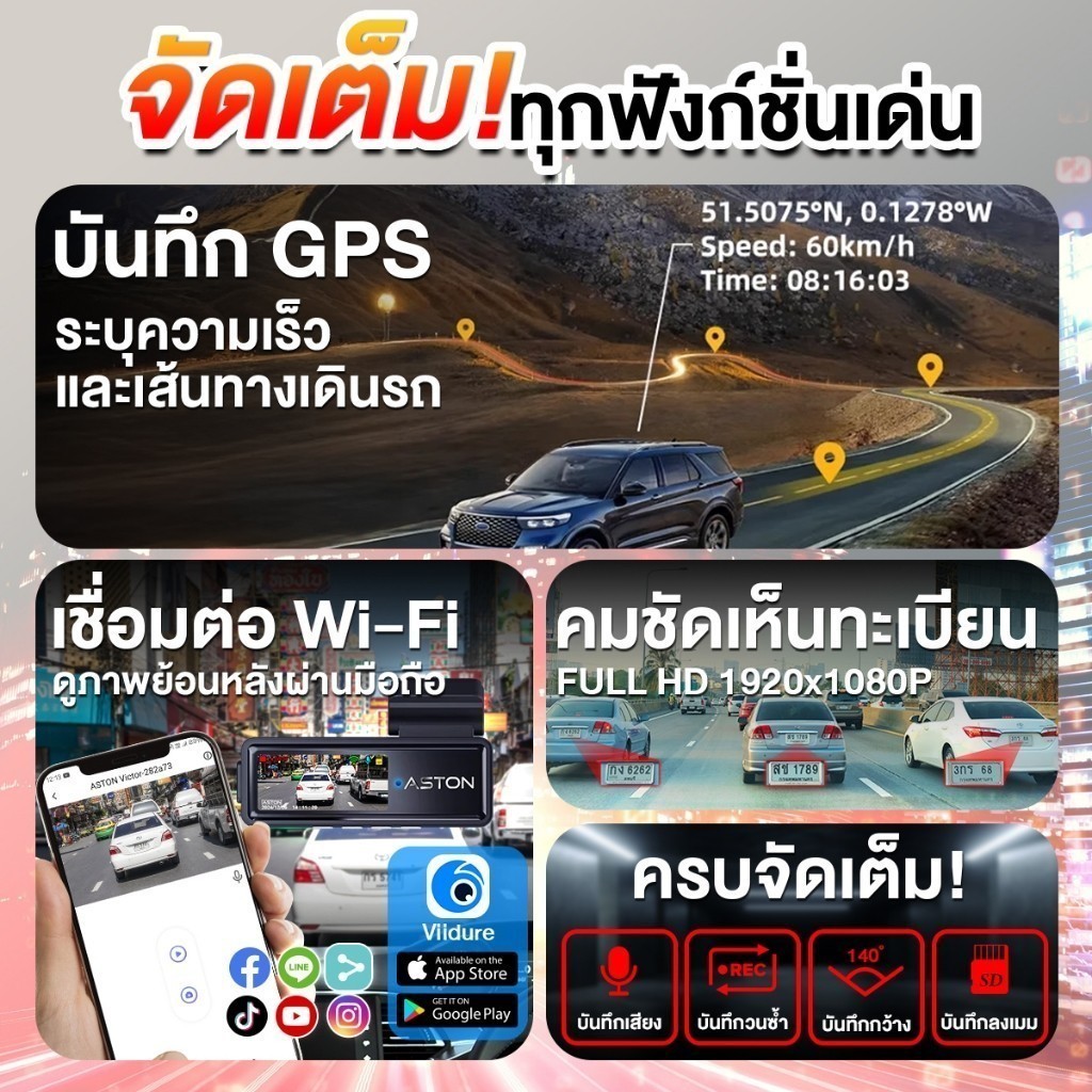 ASTON Victor กล้อง GPS ติดรถยนต์ Wifi ติดรถยนต์ 140 องศา ดูภาพและความเร็ว ผ่านแอพ บันทึกความเร็ว รับประกัน 1 ปี