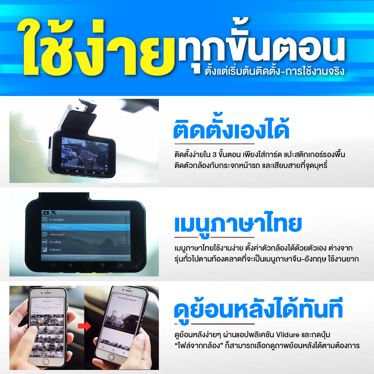 | การเชื่อมต่อ | Wi-Fi (App viidure) | ดู/ดาวน์โหลดไฟล์ผ่านมือถือได้ทันที |