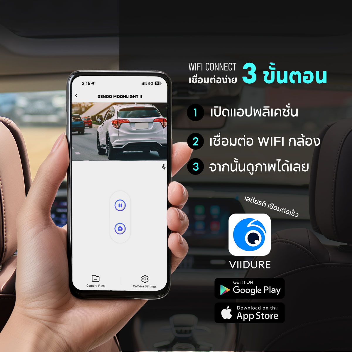 A: ได้ครับ กล้องติดรถยนต์ dash cam รุ่นนี้มี Wi-Fi ในตัว สามารถเชื่อมต่อกับแอปพลิเคชัน viidure เพื่อดูภาพสด ดาวน์โหลดไฟล์ และตั้งค่าต่างๆ ได้ทันที