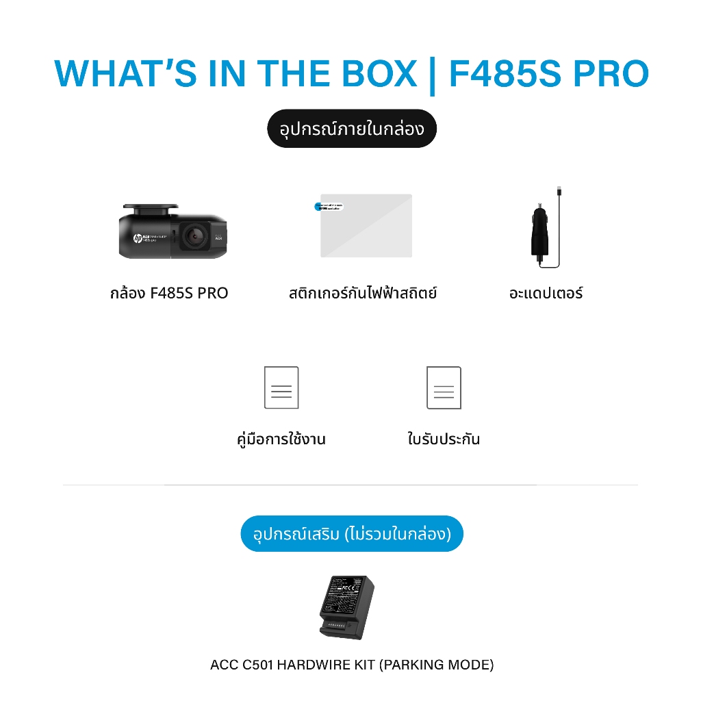 | โหมดจอดรถ (Parking Mode) | รองรับ (ต้องใช้อุปกรณ์เสริม ACC C501) |