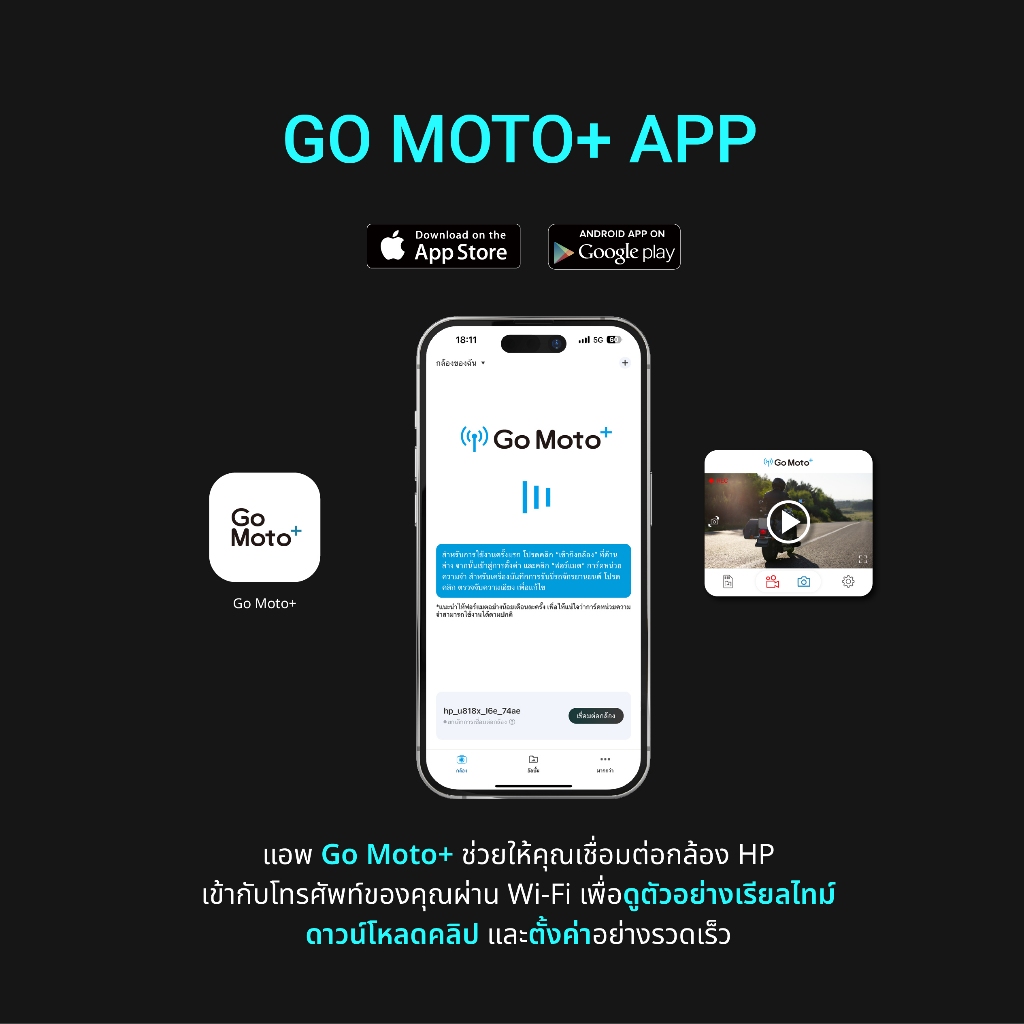 ตัวกล้องมีขนาดกะทัดรัด น้ำหนักเบาเพียง 50.6 กรัม ติดตั้งง่าย ไม่บดบังทัศนวิสัย มาพร้อม Wi-Fi ในตัว ให้คุณสามารถเรียกดูและดาวน์โหลดวิดีโอผ่านแอปพลิเคชัน Go Moto+ บนสมาร์ทโฟนได้ทันที ไม่ต้องถอดเมมโมรี่การ์ดให้วุ่นวาย กล้องติดหน้ารถยนต์ รุ่นนี้ถูกออกแบบมาเพื่อคนยุคใหม่ที่ต้องการความมั่นใจสูงสุด และความสะดวกสบายในการใช้งานจริง