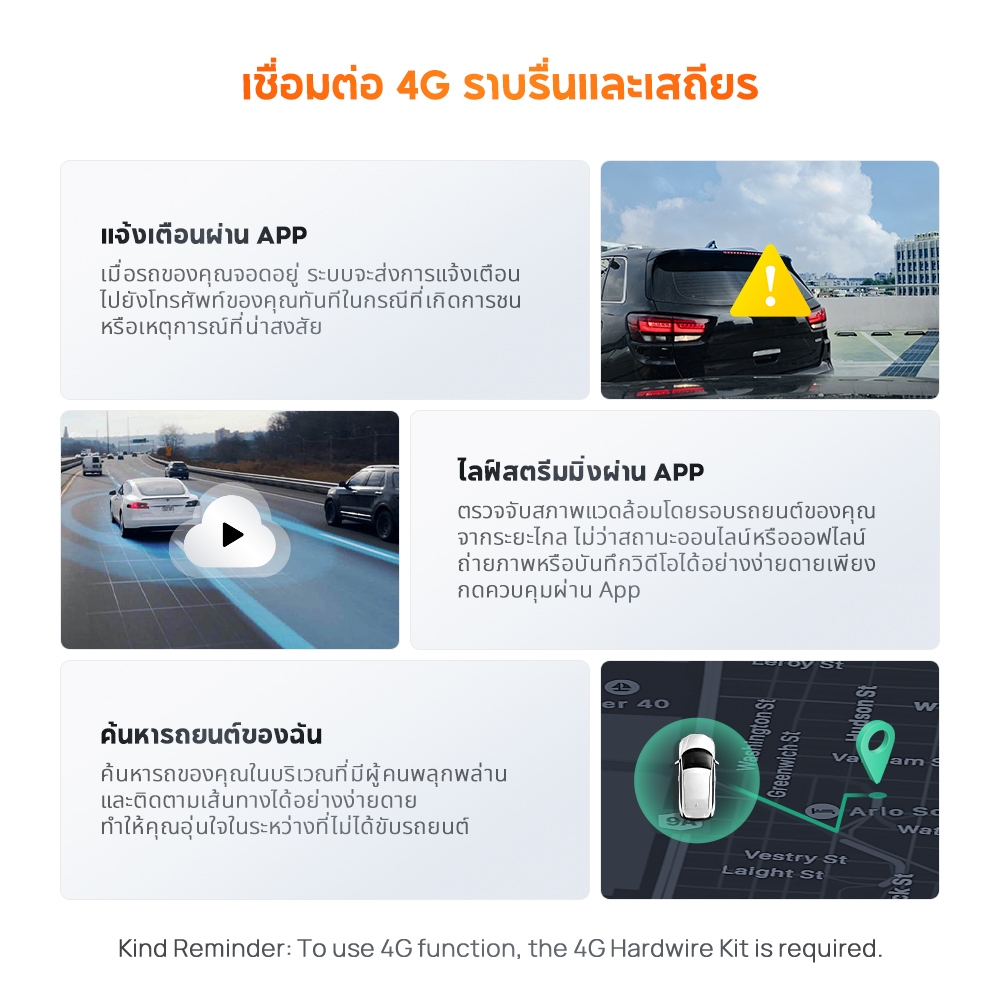 A: ใช่ครับ ฟังก์ชัน 4G และการแจ้งเตือนขณะจอด (Parking Monitoring) ที่สมบูรณ์แบบ ต้องใช้อุปกรณ์เสริมฮาร์ดแวร์เพิ่ม
