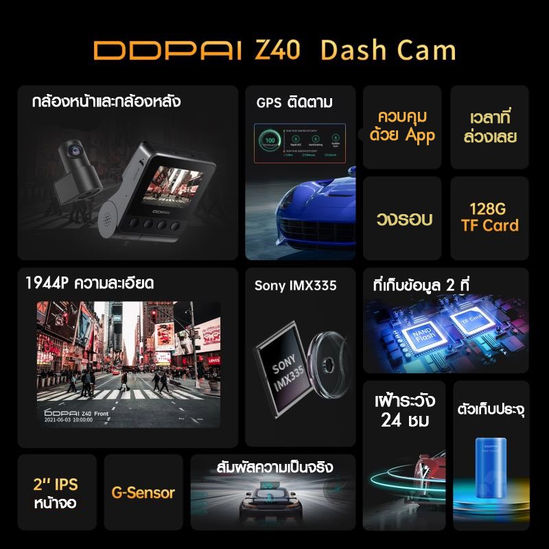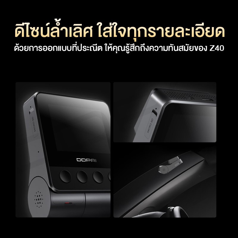 | คุณสมบัติ | DDPAI Z40 (กล้องหน้า) | DDPAI Z40 Dual (กล้องหน้า+หลัง) | DDPAI Z40 GPS (กล้องหน้า+GPS) | DDPAI Z40 GPS Dual (รุ่นนี้) |