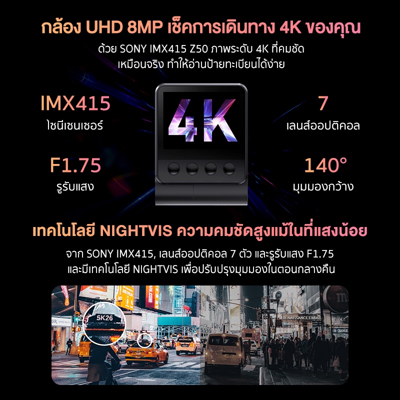 DDPAI Z50 คือสุดยอดกล้องติดรถยนต์ 4K ที่ถูกออกแบบมาเพื่อความปลอดภัยสูงสุดของคุณ ด้วยการใช้เซ็นเซอร์ Sony IMX415 ทำให้กล้องหน้ารุ่นนี้สามารถบันทึกภาพได้คมชัดระดับ Ultra HD 8MP หรือ 4K (2160P) รายละเอียดทุกอย่างคมชัดเหมือนตาเห็น ไม่ว่าจะเป็นป้ายทะเบียน หรือใบหน้าคู่กรณี ในรุ่น DDPAI Z50 GPS Dual คุณจะได้รับกล้องหน้า 4K และกล้องหลังรถยนต์ Full HD 1080P ที่หมุนได้ 360 องศา ครอบคลุมทั้งด้านหน้าและด้านหลัง ไร้มุมอับ