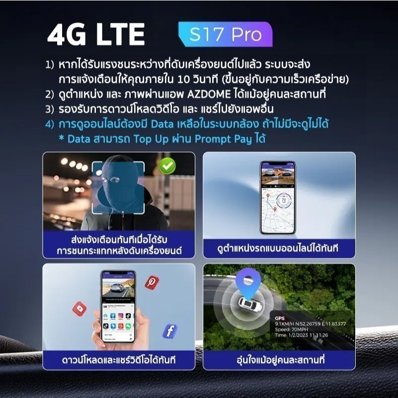 สิ่งที่ทำให้ S17 PRO แตกต่างคือ เทคโนโลยี 4G eSim ในตัว ที่ให้คุณสามารถ ดูออนไลน์ ติดตามความเคลื่อนไหวและตำแหน่งรถของคุณได้แบบ Real Time ผ่านแอปพลิเคชัน AZDOME แม้คุณจะไม่ได้อยู่ที่รถ! และไม่ต้องกังวลเรื่องความร้อน เพราะตัวเครื่องใช้ Super Capacitor แทนแบตเตอรี่ จึงทนทานต่อสภาพอากาศร้อนจัดในประเทศไทยได้เป็นอย่างดี ติดตั้งง่ายด้วย 3M Sticker ไม่หลุดเมื่อเจอแดดแรง พร้อมเป็นเพื่อนคู่ใจในการขับขี่และเป็นพยานปากสำคัญให้กับคุณ