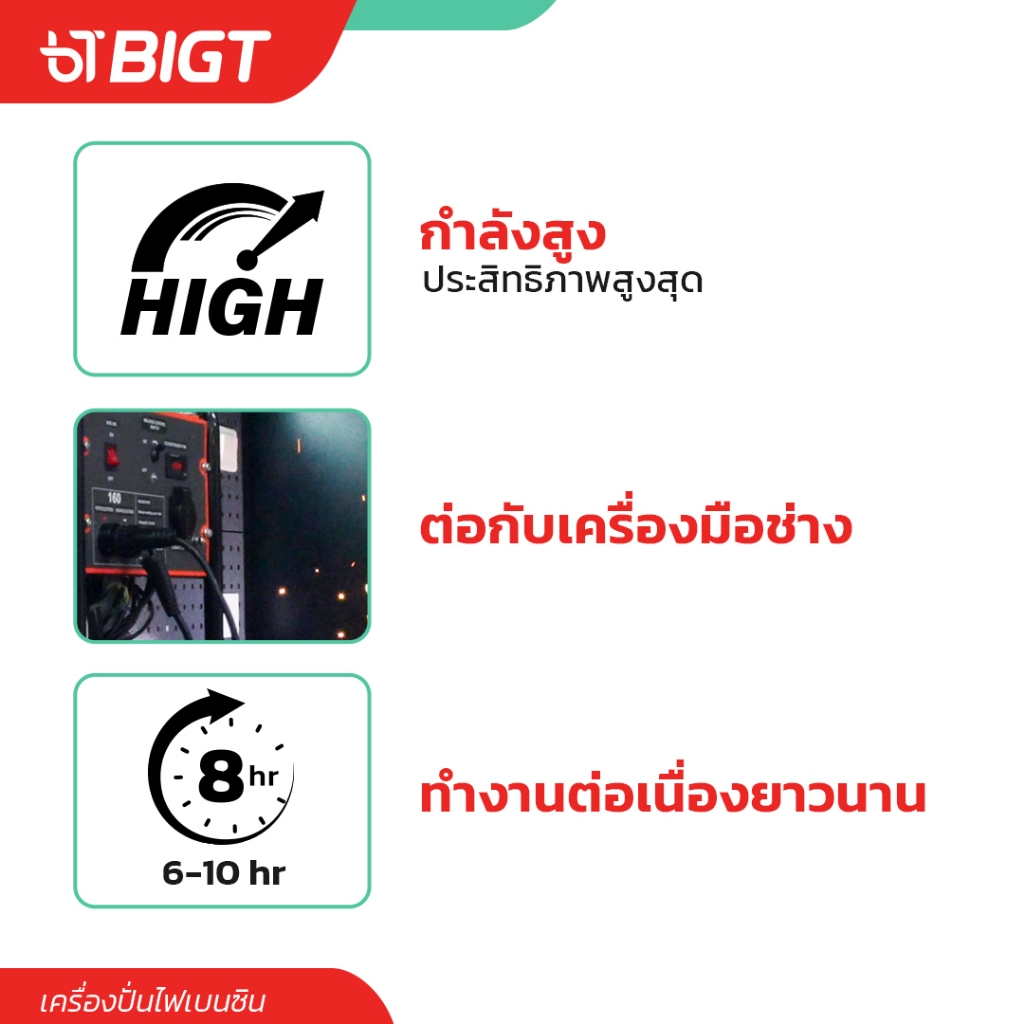 | เวลาใช้งานต่อเนื่อง | ~10 ชั่วโมง | ~8 ชั่วโมง | ที่ถังน้ำมันเต็ม 25 ลิตร |