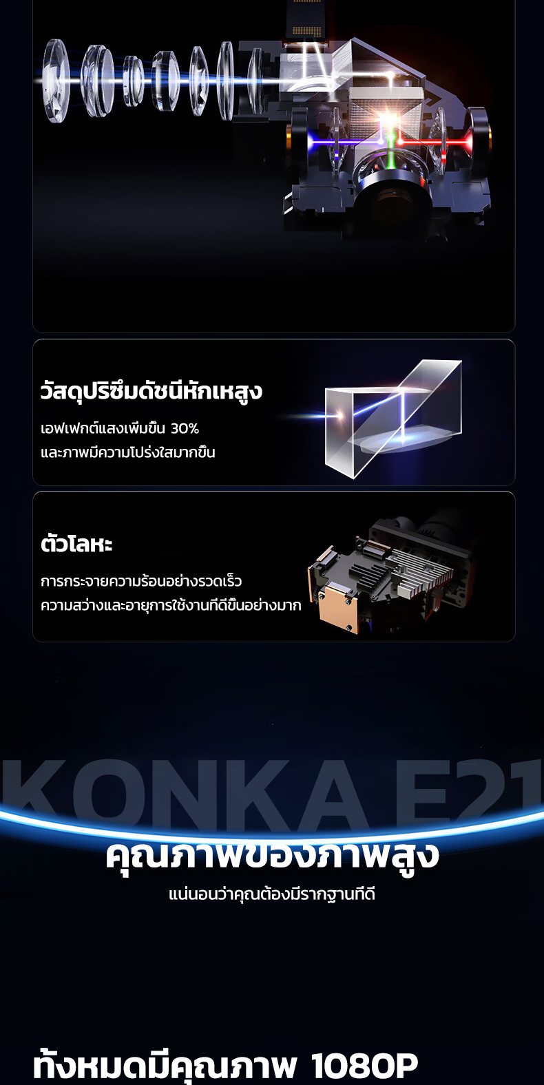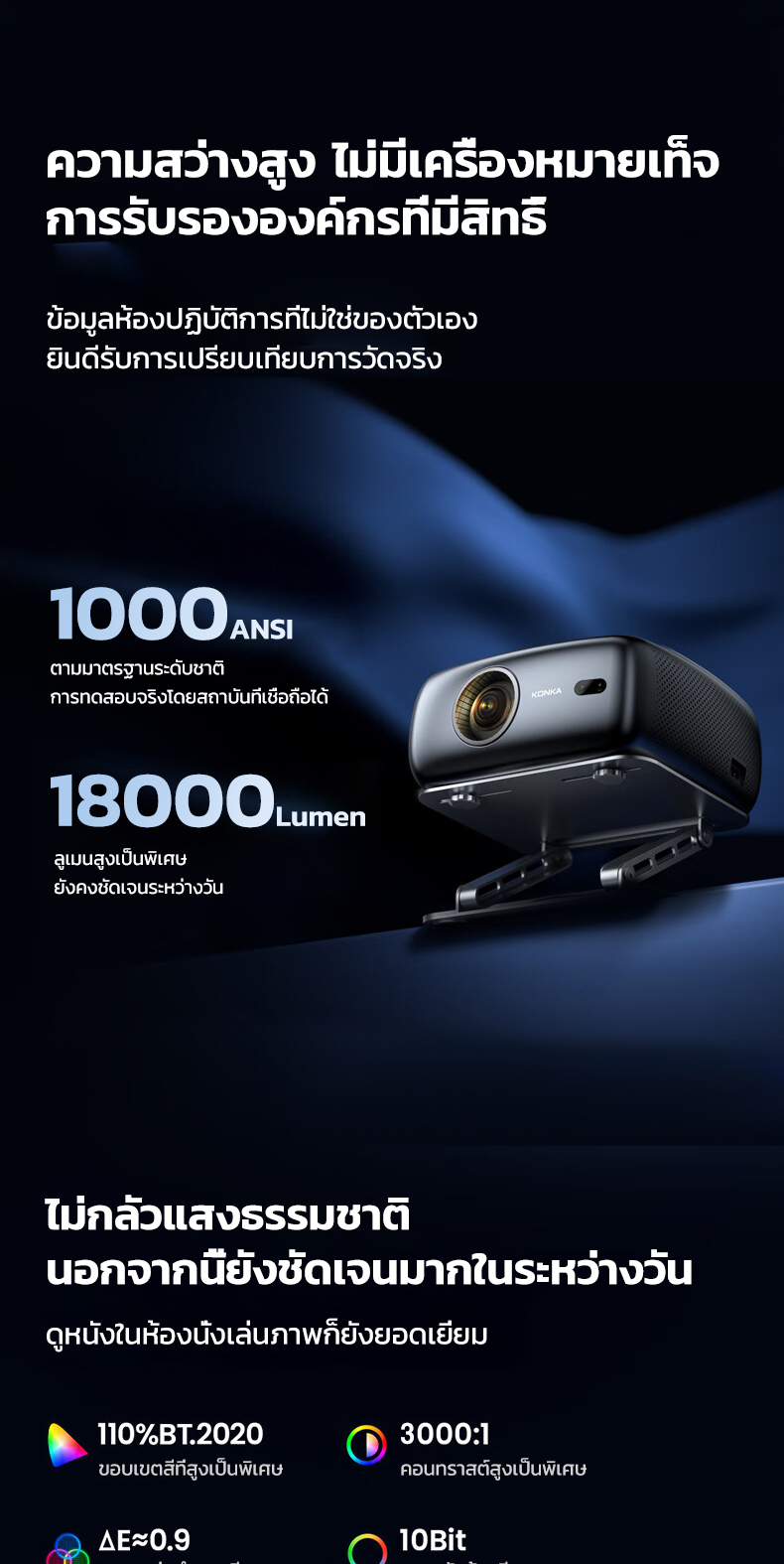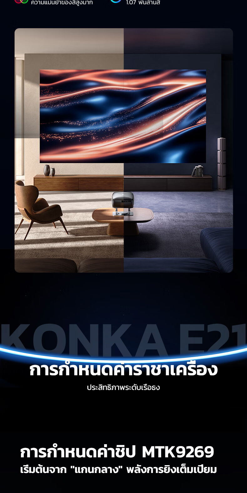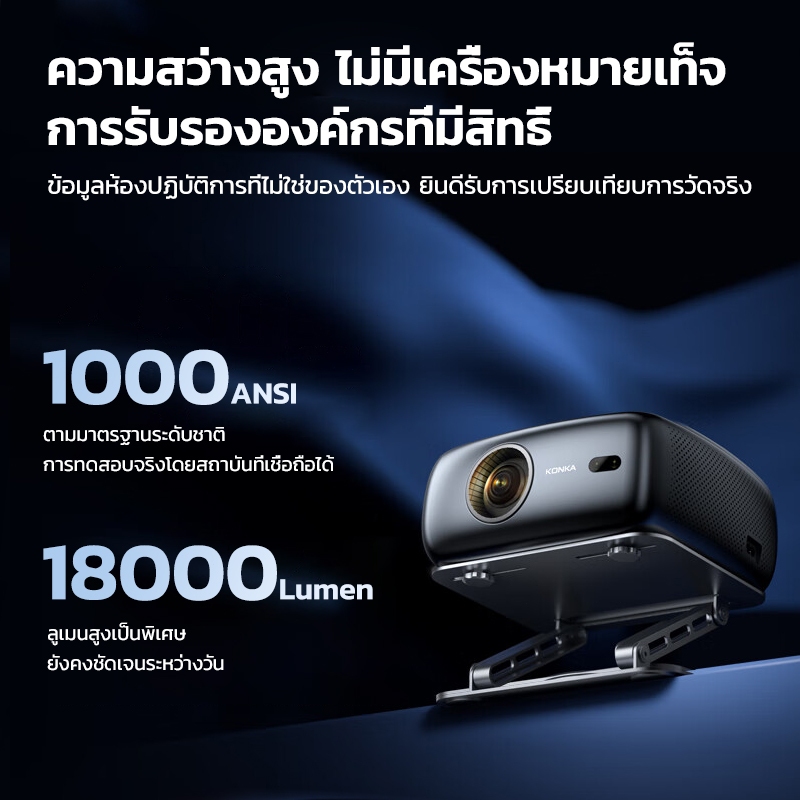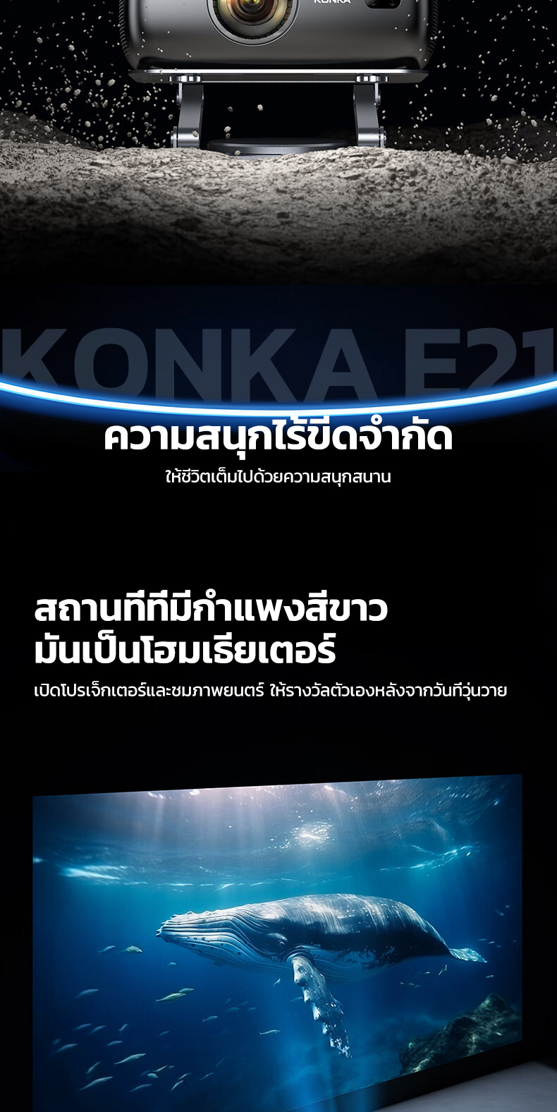 เตรียมพบกับสุดยอด โปรเจคเตอร์พกพา ที่จะมาปฏิวัติการดูหนังของคุณ! KONKA E21 คือ เครื่องฉายโปรเจคเตอร์ ที่ถูกออกแบบมาเพื่อคนยุคใหม่ที่ต้องการความสมบูรณ์แบบและความสะดวกสบายสูงสุด ด้วยความสว่างที่มากถึง 1000 ANSI (18000 Lumen) ทำให้คุณสามารถเปิดไฟดูหนังได้สบาย ๆ หรือจะฉายในตอนกลางวันก็ยังคมชัด ไม่ต้องพึ่งพาความมืดอีกต่อไป!