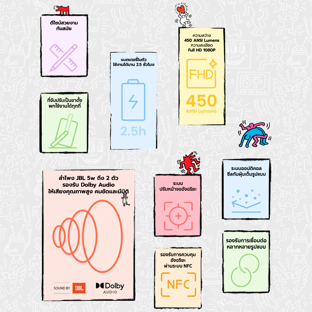 ด้วยค่าความสว่างสูงถึง 450 ANSI Lumens และความละเอียด Full HD 1080P ทำให้คุณสามารถฉายภาพยนตร์ที่คุณรักบนผนังขนาด 40-120 นิ้วได้อย่างเต็มตา คมชัดทุกรายละเอียด แม้ในสภาวะที่มีแสงน้อย และที่เด็ดกว่านั้นคือระบบเสียง Sound by JBL 5W x2 ที่รองรับ Dolby Audio มอบพลังเสียงที่ลึกและมีมิติ เหมือนยกโรงภาพยนตร์มาไว้ในบ้านคุณเลยทีเดียว